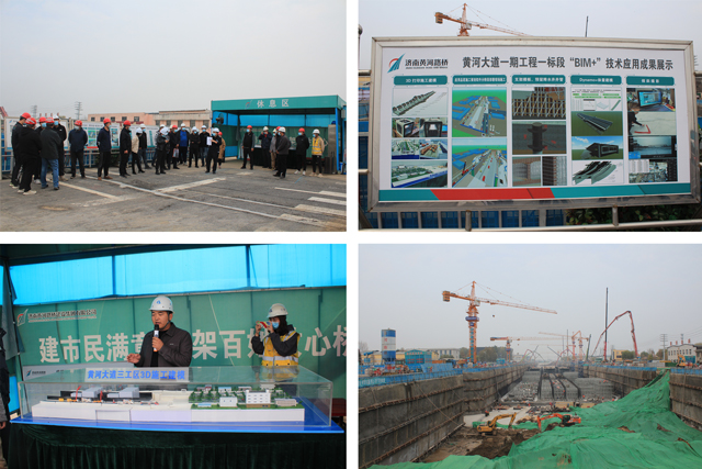 觀摩團首先參觀了黃河大道項目展板區(qū)及3D施工建模模型,本區(qū)域展示了項目概況及工程總平面布置,利用Revit三維模型可視化特點,直觀展示了工程建設情況。