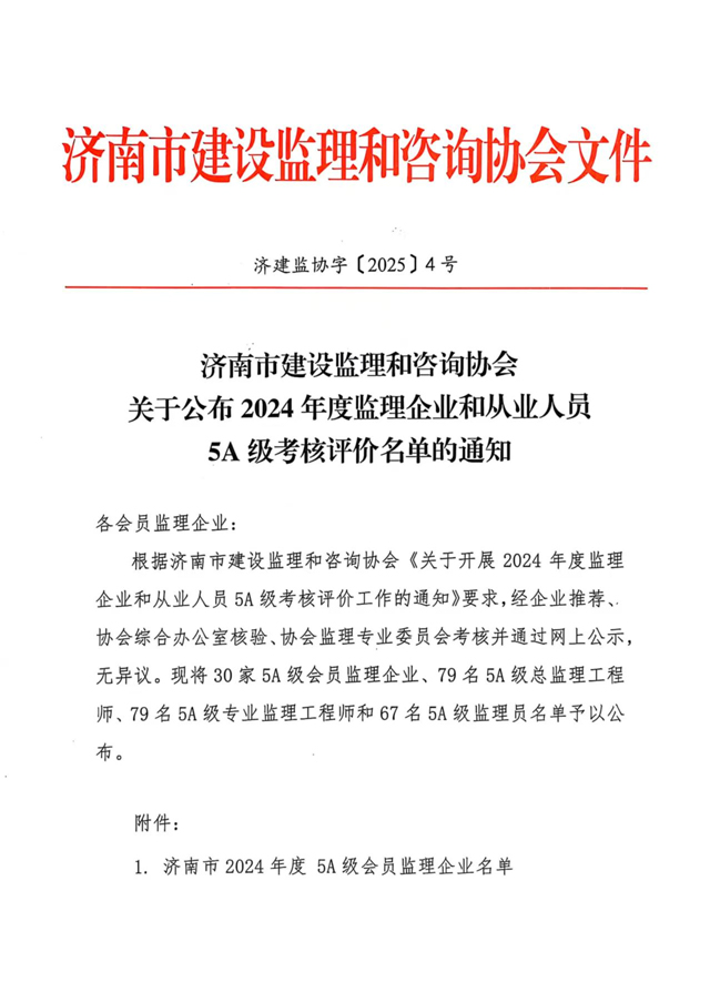 近日,濟(jì)南市建設(shè)監(jiān)理和咨詢協(xié)會(huì)發(fā)布《關(guān)于公布 2024 年度監(jiān)理企業(yè)和從業(yè)人員 5A 級(jí)考核評(píng)價(jià)名單的通知》,我司憑借專業(yè)的技術(shù)實(shí)力、規(guī)范的管理水平與卓越的服務(wù)品質(zhì),成功獲評(píng)“濟(jì)南市 2024 年度 5A 級(jí)會(huì)員監(jiān)理企業(yè)”;同時(shí),公司多名員工在個(gè)人評(píng)選中脫穎而出,榮獲“5A 級(jí)監(jiān)理從業(yè)人員”榮譽(yù)!